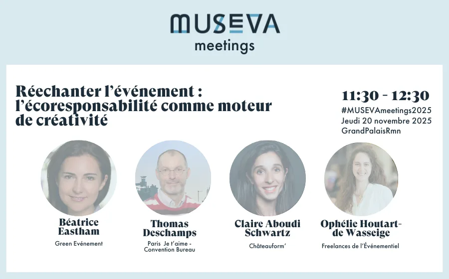 jeudi 20 novembre | 11:30 à 12:30Depuis trois ans, MUSEVA meetings explore la question environnementale dans l’événementiel. En 2025, il est temps d’aller…